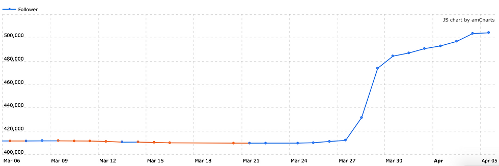 Un momento di svago ma anche di rinnovata celebrità per la nostra Giovanna Coletti (quanto fa figo chiamarsi JO EH?) che ha visto una crescita immediata della fan base del suo profilo instagram, con un picco assoluto la notte del 28 marzo, ad una crescita continua e costante per tutta la settimana, fino a superare la soglia del mezzo milione di followers. Più di 90mila persone in una sola settimana (fonte Ninjalitics). 90 mila persone che potrebbero significare un disco di platino, in termini discografici.